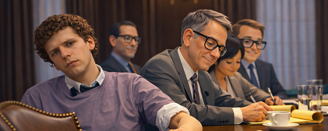Original frame from The Social Network (2010), directed by David Fincher. © Columbia Pictures Industries, Inc. AI-assisted transformation using DALL·E 3, edited by James Baty. Used under fair use for artistic commentary, research and education.