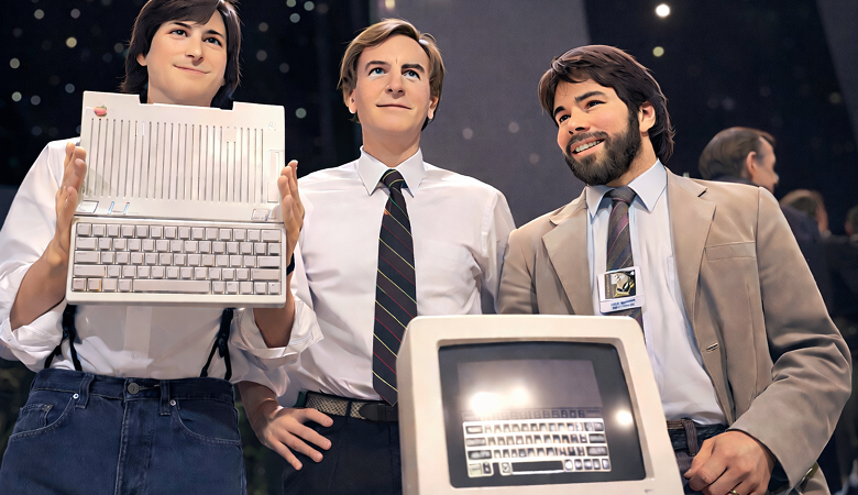 Original photo of Jobs, Sculley, Wozniak unveiling Apple II by Hal Seder © Associated Press, 1984. AI-assisted transformation using DALL·E 3, edited by James Baty. Used under fair use for artistic commentary, research and education.