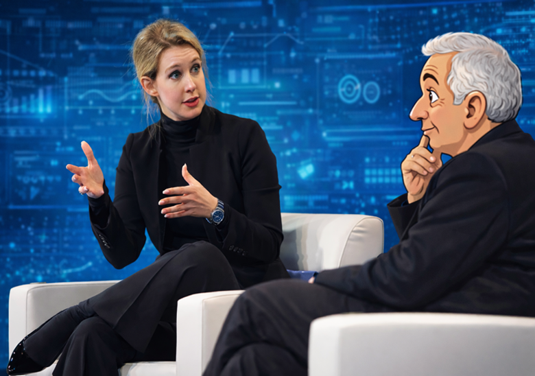 Original photo Elizabeth Holmes, WSJDLive, © REUTERS/Mike Blake (2015.) AI-assisted transformation using DALL·E 3, edited by James Baty. Used under fair use for artistic commentary, research
