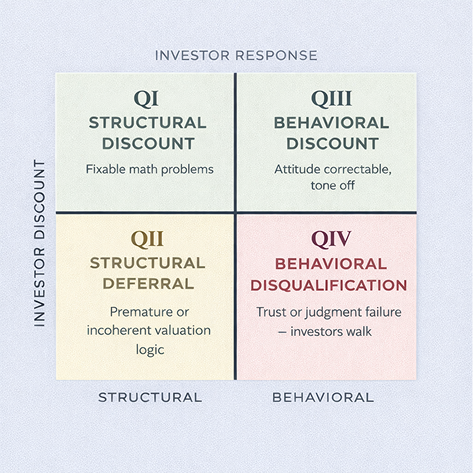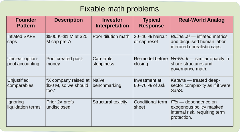 The hardest truth: valuation failure is rarely fraud — but it is often a mirror. Many of the red flags we see aren’t signs of deception; they’re signs of inexperience. Overconfidence, unclear dilution math, inflated comps — these aren’t moral failings, they’re correctable gaps. The investor’s job is not just to price risk, but to translate enthusiasm into discipline.