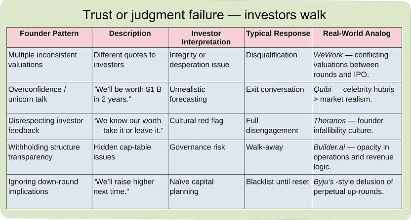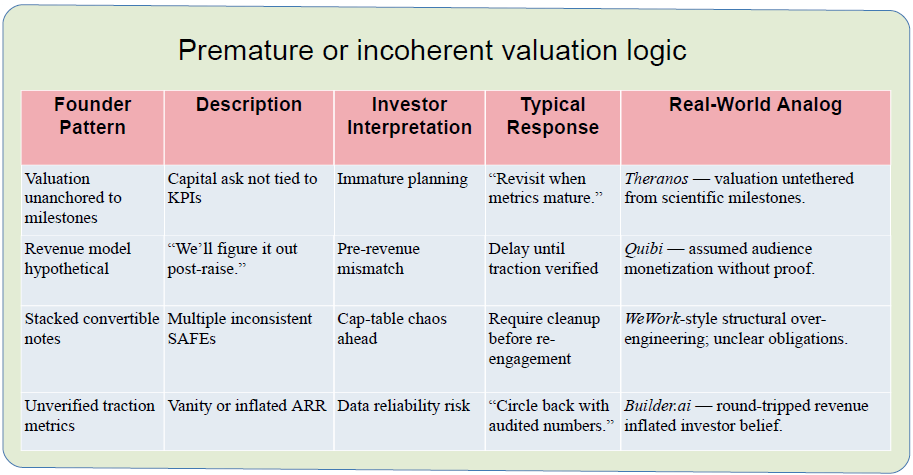 Why it’s a mistake: Seasoned investors see this as ego-pricing. Valuation reflects risk, traction, and capital efficiency — not charisma. Overpricing inflates expectations and constrains optionality.