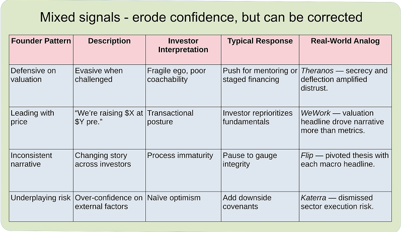 Why it’s a mistake: Investors are testing coachability, not dominance. Defensiveness signals fragility and requires more discovery.